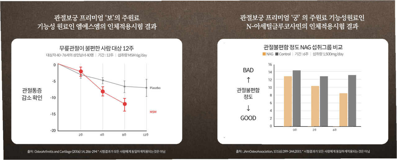 “관절보궁 제작사에 따르면 보의 주원료 MSM과 관절보궁 궁의 주원료 N-아세틸글루코사민, 칼슘, 비타민D는 모두 식품의약품안전처에서 기능성을 인정받은 원료로 뼈의 형성과 유지에 도움을 주고 골다공증 발생 위험을 감소시키며 관절 및 연골 건강에 도움을 주고 , 사포닌의 핵심성분 Rg3와 최종 대사물Compound-K를 대폭 함유하여 체내 흡수율을 높였다고 한다.