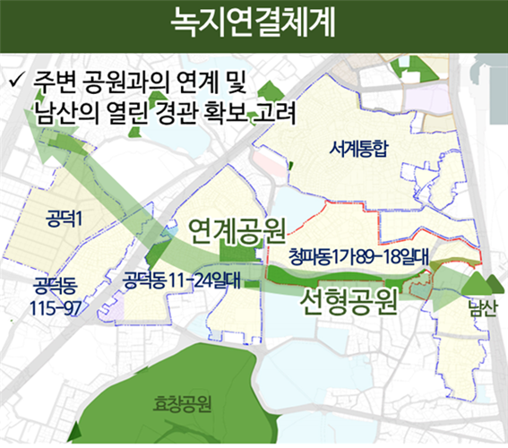 ✅ 푸른언덕(靑坡, 청파) 길 공원을 계획하여 남산으로 열린 통경축 확보