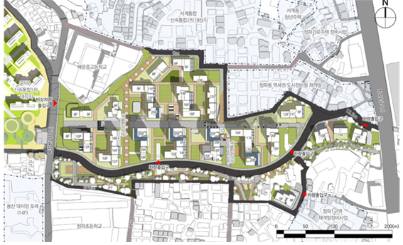청파동 1가 89-18 일대 세부내용 청파동 1가 89-18일대는 주거환경이 열악한 상황으로 노후주택 비율이 높았기 때문에 제2종 주거지역으로 용도지역 상향과 유연한 높이 계획이 적용될 예정입니다. 또한 도로체계의 재정비와 초등학교와의 통학길을 계획하여 보다 나은 주거 환경을 조성할 것입니다.