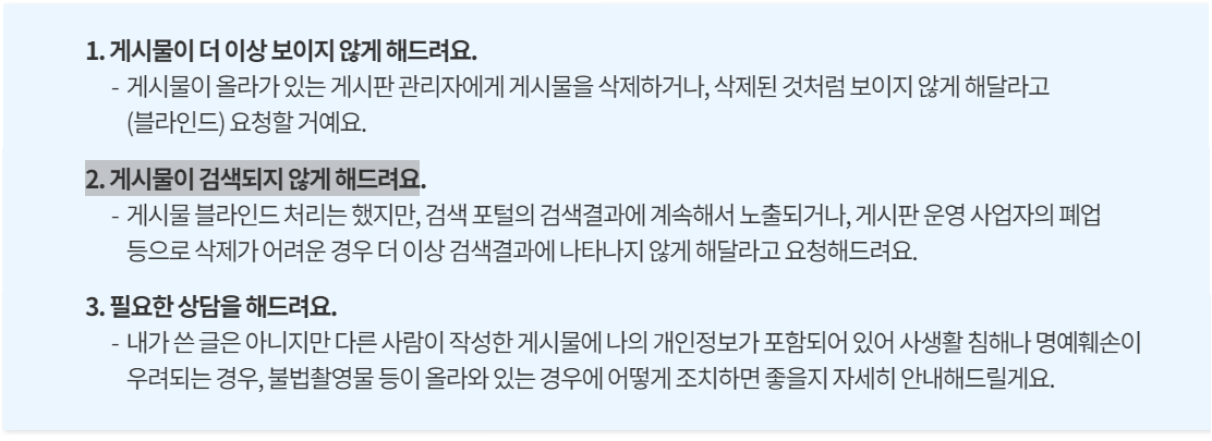 일반적으로 자신이 올린 게시물은 직접 삭제할 수 있지만, 해당 누리집·커뮤니티를 이미 탈퇴했거나, 계정정보 또는 게시물 삭제 비밀번호 등을 잊어버린 경우와 같이 본인이 직접 삭제하기가 어려운 때 만 24세 이하 국민 누구나 ‘잊힐 권리 서비스’로 자기게시물 접근배제를 요청할 수 있다.