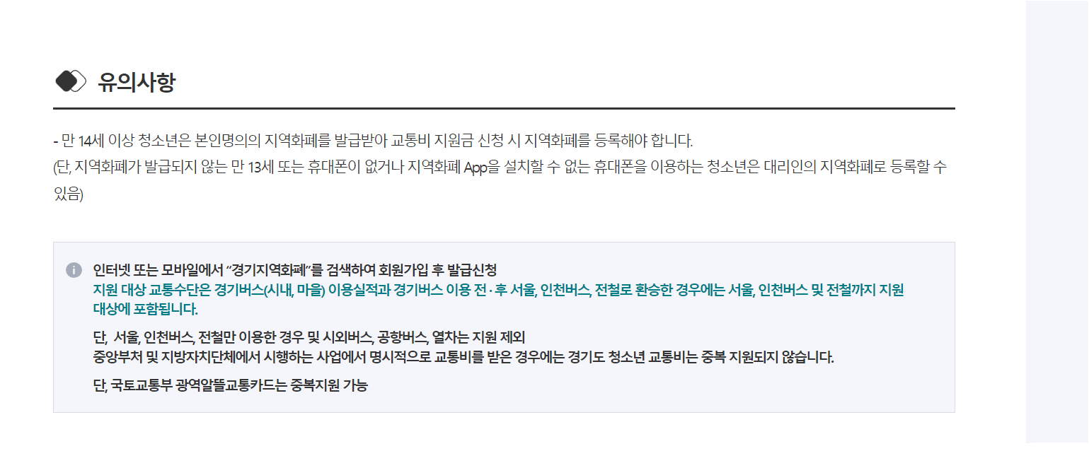 청소년 교통비지원사업이란? 경기시내버스와 마을버스 요금이 인상됨에 따라서, 대중교통의 이용 빈도는 높지만 경제적으로 열악한 청소년들을 위해 만13세에서 23세 청소년에게 상반기와 하반기 나누어 각 최대 6만원씩, 1년에 12만원을 지급하는 정책입니다. 대리 신청도 가능하니 아이가 못한다면 부모님이라도 신청해 혜택 받으세요.